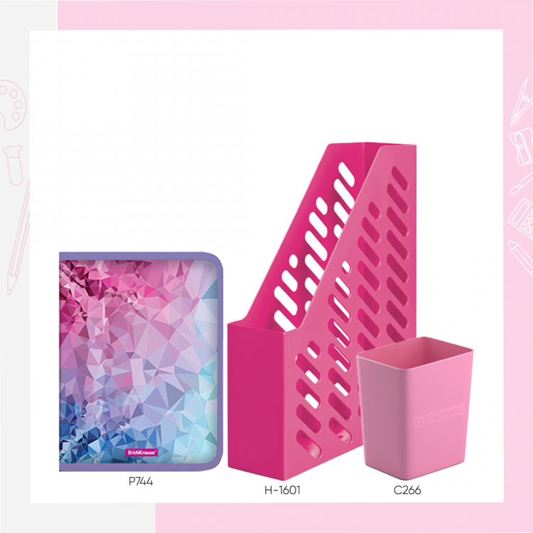 Содржи папка со декоративен геометриски дизајн, организатор за списанија и држач за моливи – идеален за уредување и подобра организација на работниот простор.