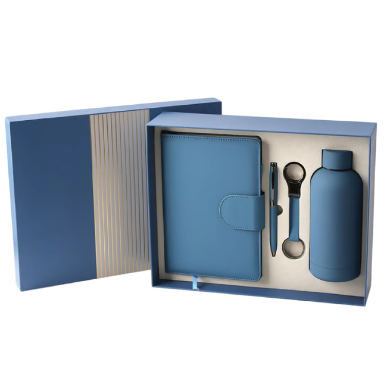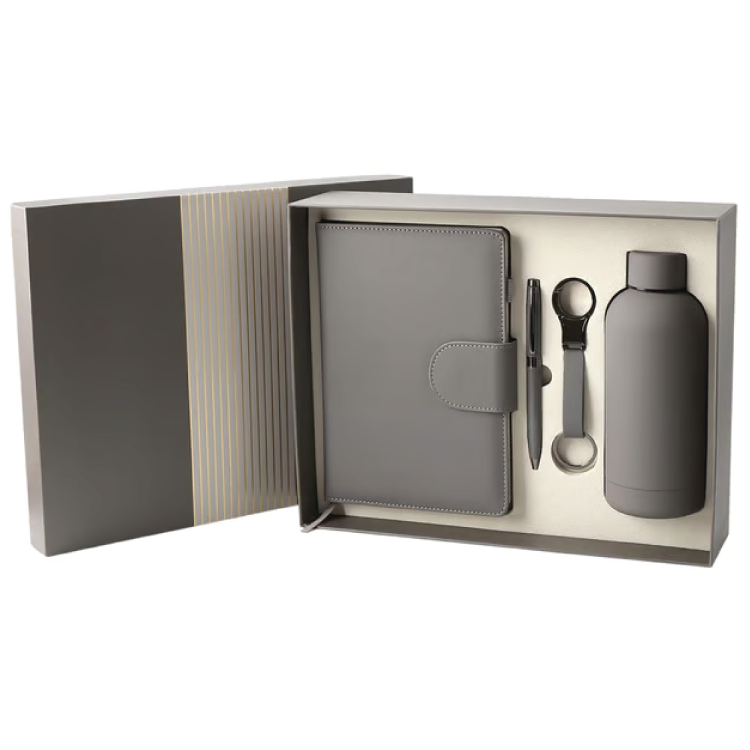 Овој елегантен корпоративен подарок-сет е идеален за „Welcome пакети“ за нови вработени, деловни партнери или VIP клиенти. Комплетот вклучува A5 нотес, метално пенкало, термо-шише и кожен приврзок за клучеви, уредно сместени во луксузна кутија со модерен дизајн. Секој елемент е изработен од квалитетни материјали како кожа (PU), метал и нерѓосувачки челик, што гарантира практичност, издржливост и професионален изглед. Со можност за персонализација и брендирање, овој сет е идеален избор за компании кои сакаат да остават силен и стилски прв впечаток.
