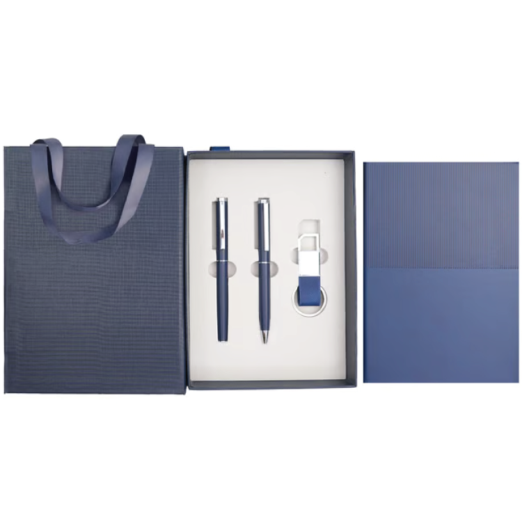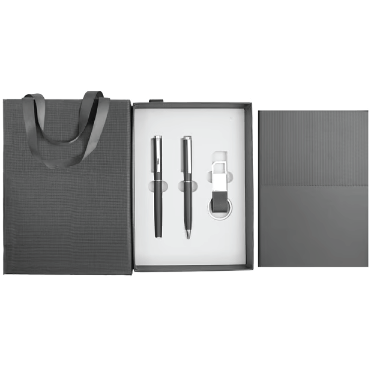 Овој елегантен подарок-сет претставува совршена комбинација на стил, функционалност и професионализам. Содржи нотес, пенкало, ролер и приврзок за клучеви, сместени во луксузна кутија со рачки – идеален избор за бизнис поклони, корпоративни настани или персонализирано брендирање. Изработен од квалитетни материјали како вештачка кожа, метал и висококвалитетна хартија, сетот остава впечаток на префинетост и внимание на детали. Совршен е за директори, колеги, деловни партнери или важни клиенти, нудејќи подарок што се користи секојдневно – а воедно ја одразува бренд-вредноста на компанијата.