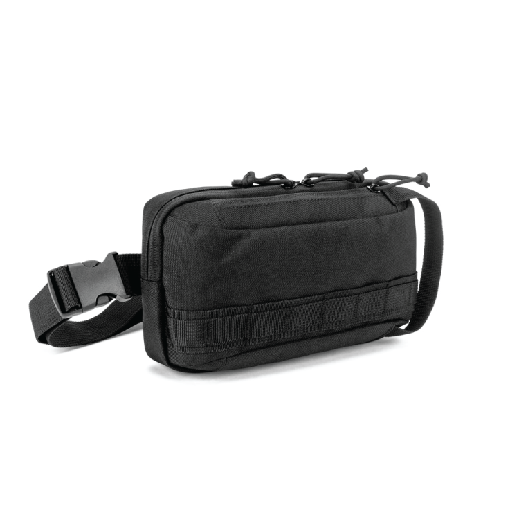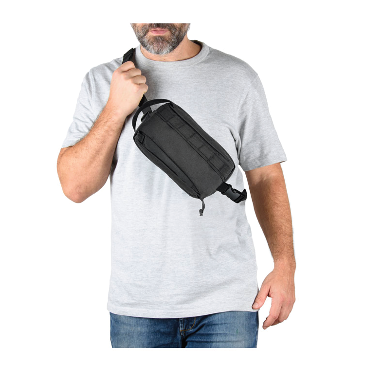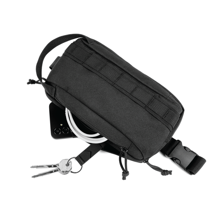 Современа торбичка изработена од висококвалитетен рециклиран полиестер (600D + 210D) со голем централен џеб и дополнителен преден џеб за лесна организација на предмети.Поседува мултифункционални ремени на предната страна за прицврстување на додатоци како клучеви или карики, што ја прави идеална за патување, спорт, планинарење или секојдневна употреба.Со прилагодлив ремен може да се носи околу половината или преку рамо, зависно од стилот и потребата.
