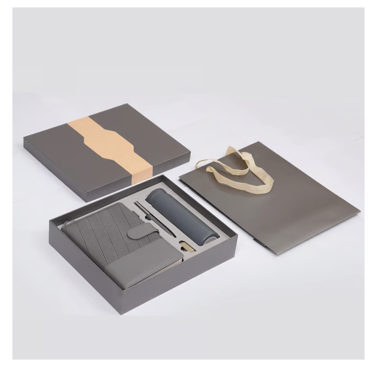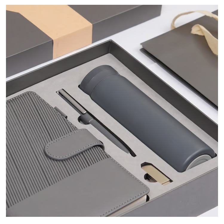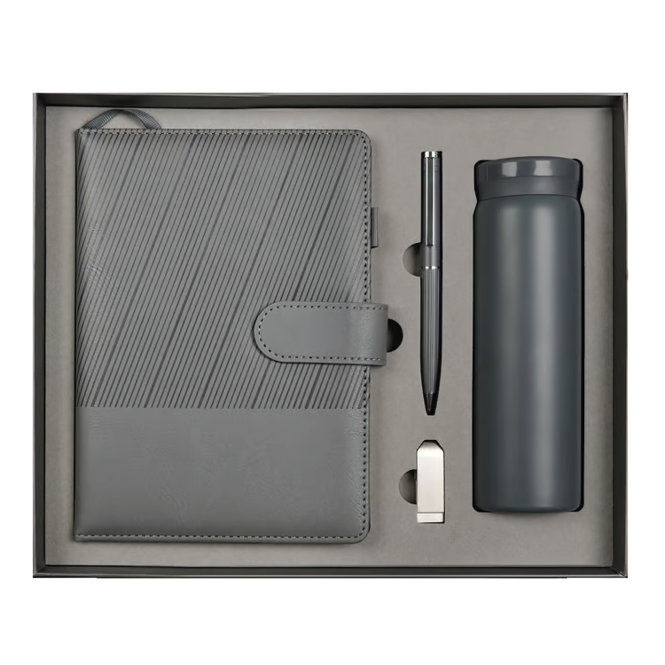 Елегантен и практичен бизнис подарок сет кој содржи нотес (А5), термос, метално пенкало, USB меморија и украсна кеса.